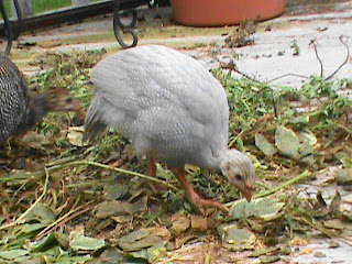 The teen Guineas are still housed in the gazebo, I toss them long grass and weeds to let them get their fill of greens. They haven't been moved to the coop yet because they need to get a bit larger to fend off the other Guineas that rejected them last time.